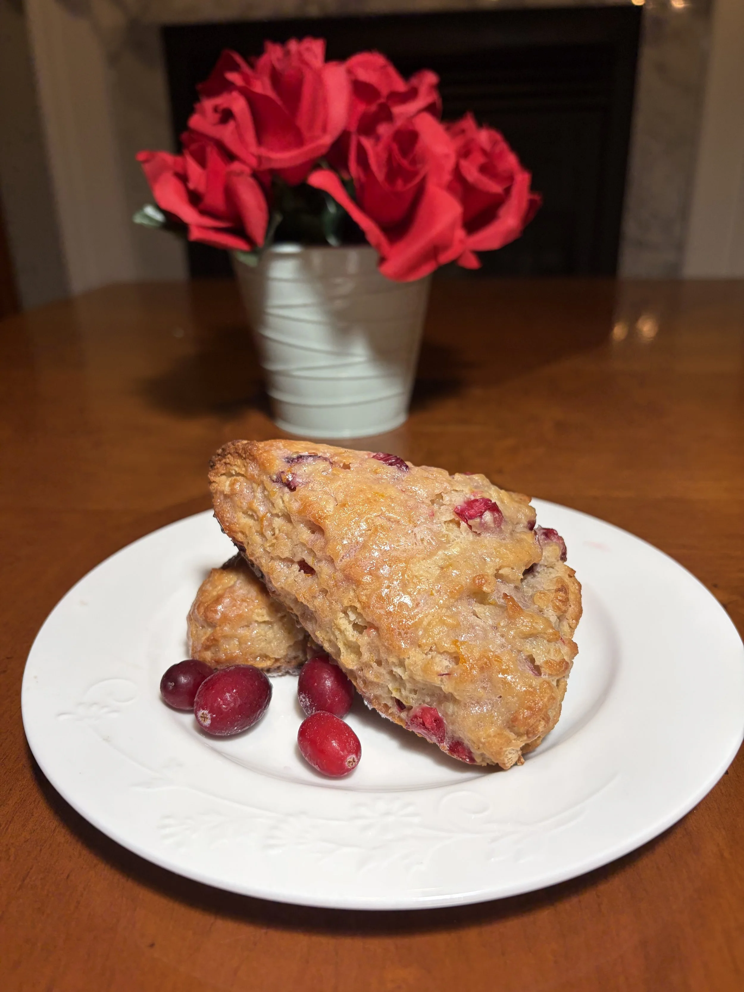Buttery sourdough scones packed with cranberries and orange zest, topped with a smooth orange glaze for a sweet , citrus finish.